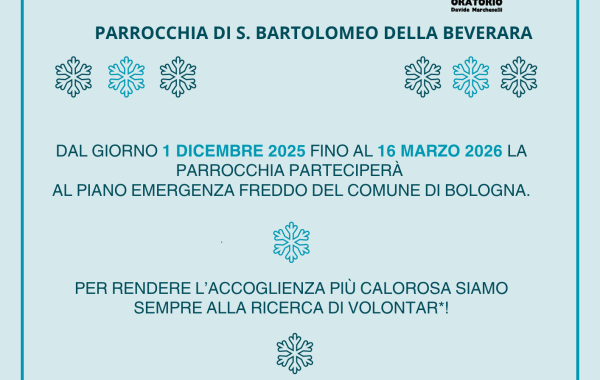 In evidenza News, Parrocchia di S. Bartolomeo della Beverara, Parrocchia di S. Martino di Bertalia, Zona Pastorale AAA cercasi – Ricerca volontari per Piano Emergenza Freddo E’ la Luce che illumina il buio In ricordo di Don Nildo Pirani E’ dalle crepe che passa la luce Tutte le notizie Appuntamenti Tutti gli Appuntamenti Le parrocchie della Zona Pastorale Santi Angeli Custodi Sacro Cuore di Gesù Gesù Buon Pastore S. Cristoforo S. Ignazio di Antiochia S. Girolamo dell’Arcoveggio S. Martino di Bertalia S. Bartolomeo della Beverara Le ultime news della Zona Pastorale AAA cercasi – Ricerca volontari per Piano Emergenza Freddo Da Lunedì 1 dicembre verranno ospitate in un locale della parrocchia della Beverara, per il periodo notturno dalle ore 20… > 20 Novembre 2025 Orario messe estive 2025 29 Giugno 2025 Incontri popolari di lettura della Bibbia Tutti i martedì di Quaresima, a partire da martedì prossimo 11 marzo e per cinque serate, si terranno in Chiesa… > 8 Marzo 2025 Stazioni Quaresimali 2025 3 Marzo 2025 Tutte le notizie della Zona Pastorale I nostri canali e link