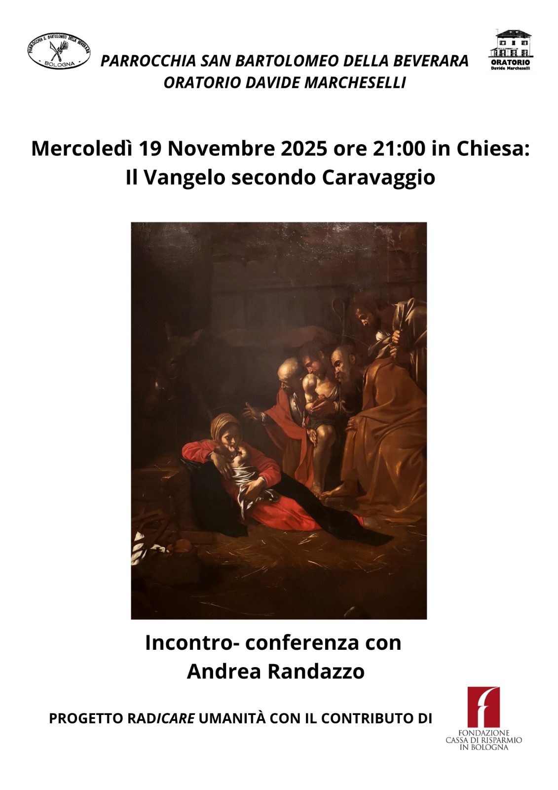 Beverara, Zona Pastorale 10 Novembre 2025 E’ la Luce che illumina il buio mercoledì 19 Novembre Descrizione: Secondo incontro-conferenza con Andrea Randazzo dal titolo “Il Vangelo secondo Caravaggio”. #oratorioaperto #radicareumanitá Fondazione Carisbo Inizio: 19/11/2025 21:00 Fine: 19/11/2025 22:59 Categorie: Beverara, Zona Pastorale