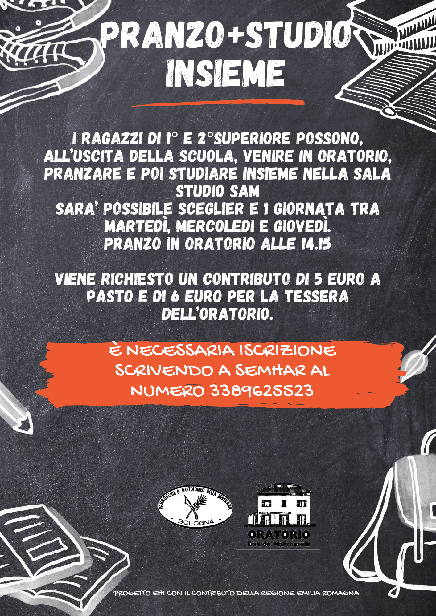 Grande novità: le ragazze e i ragazzi di 1° e 2° superiore possono, all’uscita della scuola, venire in oratorio, pranzare e poi studiare insieme nella sala studio “SAM”.